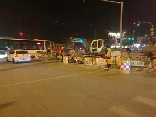 各管線橫穿濟微路的施工過程中,考慮到濟微路為南北交通主干道,本著“少封一米是一米”的施工理念,從減少交通影響,保證車輛和行人通行角度出發(fā),不但將施工全部安排在夜間10點之后,而且經(jīng)過反復(fù)優(yōu)化施工分區(qū),將原計劃半幅封閉縮小到逐車道封閉的方式進行,早6點高峰來臨前恢復(fù)交通。