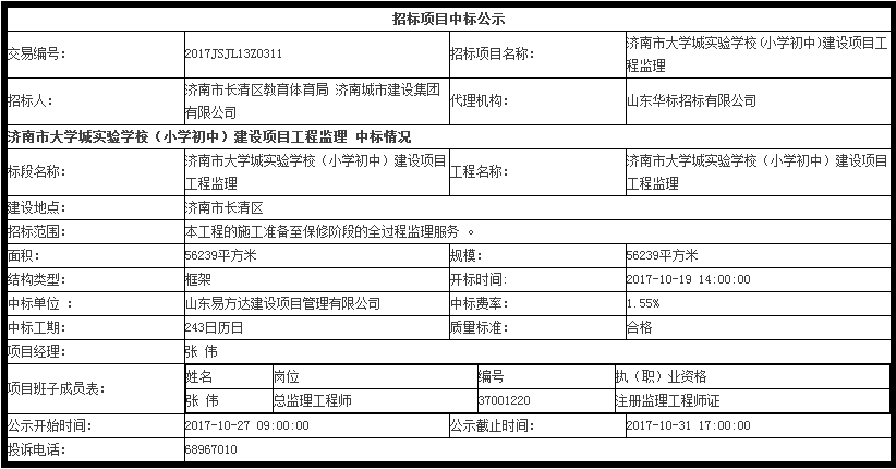 濟南市大學城實驗學校(小學初中)建設項目工程監理中標公示