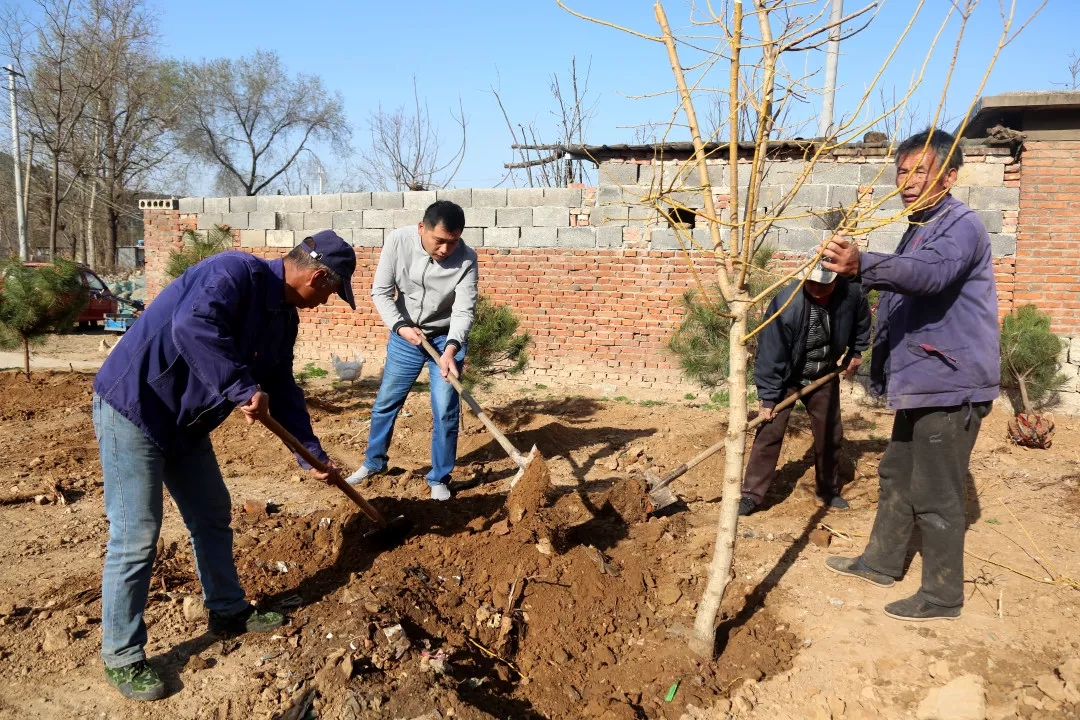 今天的第一項工作,是要在村里的公共裸土上植樹增綠。“這片位于村口的空地原來是塊荒地,時間長了成了處垃圾場,既污染環(huán)境又影響村容村貌,按照鎮(zhèn)里裸土覆綠的要求,我們用爭取的1萬元資金購買了黃金槐、黑油松、櫻花等好存活且觀賞性較強的苗木,把原荒地整平后進(jìn)行裸土覆綠”王棟棟說道。
