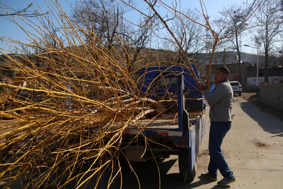 “他們都這么大年紀(jì)了,還來幫村里干活,咱這年輕人更不能閑著啊”,扛樹苗、揮鍬培土,王棟棟俯下身子,干得有模有樣。一個小時的忙碌,裸土煥然一新,一片新綠裝點著山村的早春。