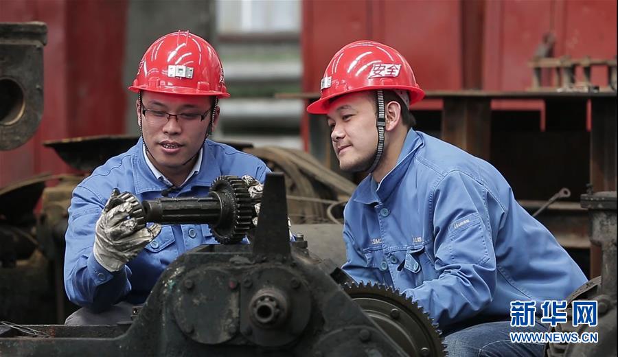 全國(guó)人大代表、山西焦煤西山煤電杜兒坪煤礦的董林(左)為職工講解設(shè)備構(gòu)造和傳動(dòng)原理(2018年4月25日攝)。新華社發(fā)