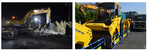 現場共有銑挖機、銑刨機、各型挖掘機、200t起重機、壓路機等119臺機械及備用機具。