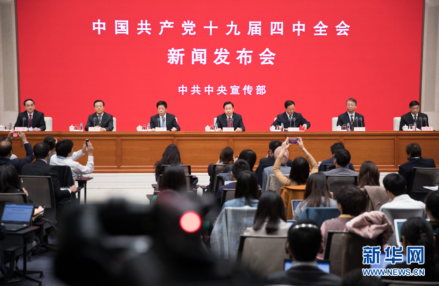 11月1日,中共中央宣傳部在北京舉行中國共產(chǎn)黨十九屆四中全會新聞發(fā)布會,請中央宣傳部分管日常工作的副部長、中央政策研究室副主任王曉暉,中央政策研究室分管日常工作的副主任江金權(quán),中央財經(jīng)委員會辦公室分管日常工作的副主任韓文秀,全國人大常委會法工委主任、港澳基本法委主任沈春耀,司法部黨組書記、副部長袁曙宏,全國政協(xié)副秘書長舒啟明介紹有關(guān)情況,并答記者問。中央宣傳部副部長、國務院新聞辦公室主任徐麟主持新聞發(fā)布會。新華社記者金立旺攝