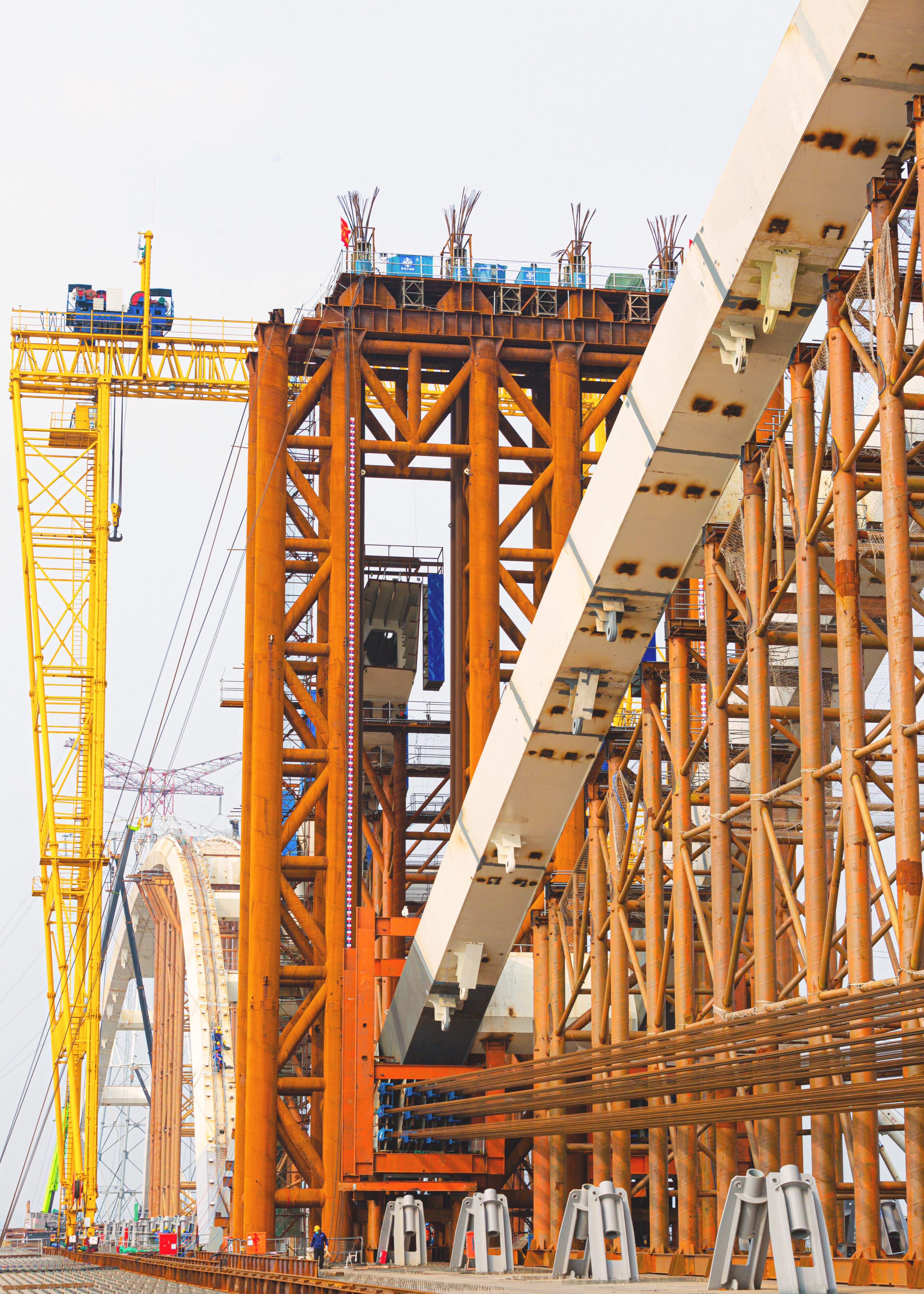 齊魯黃河大橋主跨420米拱肋提升是整個主橋施工難度最高、風險最大的關鍵節點,其提升跨度為300米,提升重量達6800噸。在拱肋架設過程中,項目克服了超重構件吊裝、拱肋節段安裝精度控制等重大難題,自主研發了120噸大規模龍門吊進行超高拱肋節段架設作業,并且項目引入了龍門吊運行狀態在線監測系統,實時監測門吊運行狀態,確保施工安全;研發設計的自動化姿態調整吊具+三向千斤頂精調系統,實現拱肋節段位置毫米級誤差安裝。