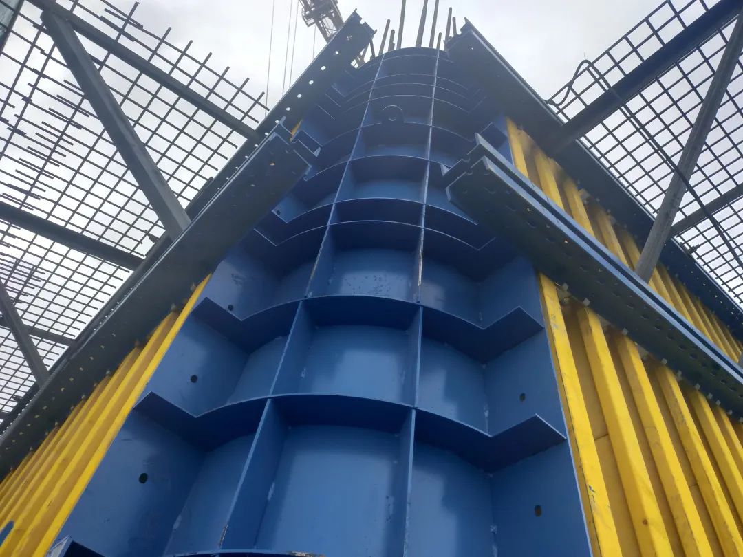 新建黃河大橋采用新橋與老橋并建的形式,在老橋下游33.5米處復線姊妹橋,兩個主塔設計高度168米,形狀為寶瓶型。“寶瓶”瓶腹處呈圓弧狀,主塔最外沿幾乎與老橋“肩并肩”,傳統(tǒng)翻模工藝需要大量的鋼管搭建支架予以支撐,空間狹窄,施工人員就更難對模板進行有效加固。