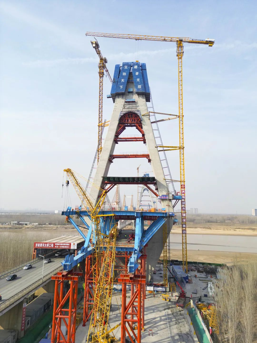 黃河流域濟南段,濟南黃河公路大橋東側,黃河上第一座不等跨并橋建設工程,同時也是黃河上跨徑最大、鋼橋總長最長的公軌分層合建橋梁,濟南黃河公路大橋改擴建工程正在有序推進工程建設。1982年建成的當時亞洲跨徑最大的濟南黃河公路大橋,在服役41年之后,見證著又一次“歷史跨越”。