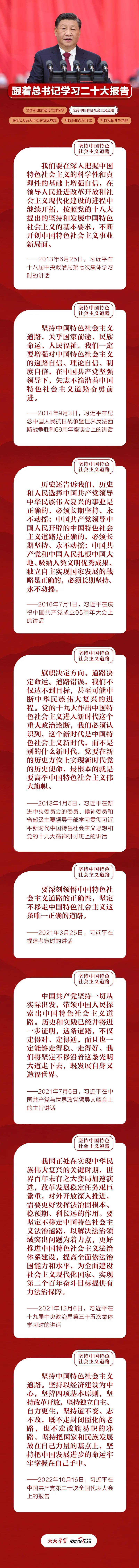 黨的十八大以來,在以習(xí)近平同志為核心的黨中央堅強領(lǐng)導(dǎo)下,我們以奮發(fā)有為的精神推動新時代中國特色社會主義不斷向前,推進(jìn)改革開放和社會主義現(xiàn)代化建設(shè)不斷深入,書寫了經(jīng)濟快速發(fā)展和社會長期穩(wěn)定兩大新篇章。歷史已經(jīng)并將繼續(xù)證明,中國特色社會主義道路不僅走得對、走得通,而且走得穩(wěn)、走得好。讓我們一起學(xué)習(xí)總書記重要論述,不斷增強中國特色社會主義道路自信,堅定不移走這條道路、與時俱進(jìn)拓展這條道路。