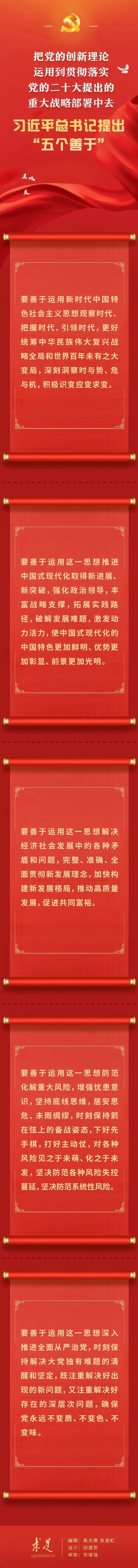 如何把黨的創(chuàng)新理論運(yùn)用到貫徹落實黨的二十大提出的重大戰(zhàn)略部署中去?在2023年第10期《求是》雜志刊發(fā)的習(xí)近平總書記重要文章《在二十屆中央政治局第四次集體學(xué)習(xí)時的講話》中,總書記提出“五個善于”的明確要求。
