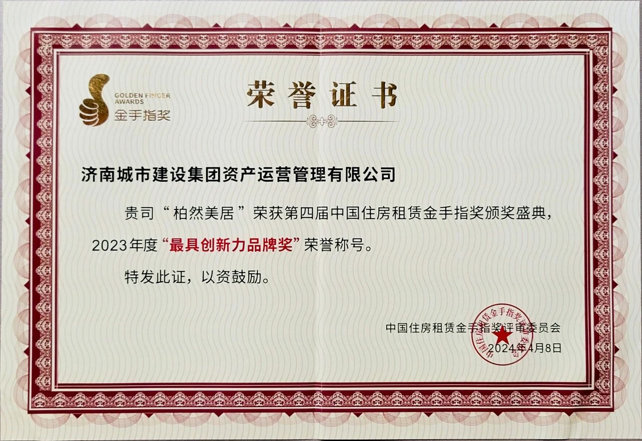 近日,在2024中國住房租賃企業(yè)家領(lǐng)袖峰會暨第四屆白云山論壇上,公布了2023年度“推動中國住房租賃發(fā)展進程”系列榜單,濟南城市建設(shè)集團資產(chǎn)運營管理有限公司成功上榜2023年度“推動中國住房租賃發(fā)展進程”百強企業(yè),公司運營的保障性租賃住房“柏然美居”品牌榮獲2023年度“最具創(chuàng)新力品牌獎”榮譽。