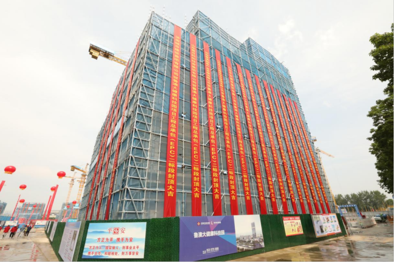 魯澳大健康科技園是山東省與澳門(mén)在中醫(yī)藥領(lǐng)域合作的核心平臺(tái),由濟(jì)南市、山東中醫(yī)藥大學(xué)、澳門(mén)科技大學(xué)三方聯(lián)手打造。項(xiàng)目位于長(zhǎng)清區(qū)大學(xué)路,總建筑面積19.6萬(wàn)㎡,是建設(shè)集團(tuán)產(chǎn)業(yè)園經(jīng)濟(jì)產(chǎn)業(yè)鏈?zhǔn)着?xiàng)目,由所屬山東貫月科創(chuàng)投資集團(tuán)投資建設(shè)。項(xiàng)目共分為兩個(gè)標(biāo)段,當(dāng)前封頂?shù)膶儆诙?biāo)段。