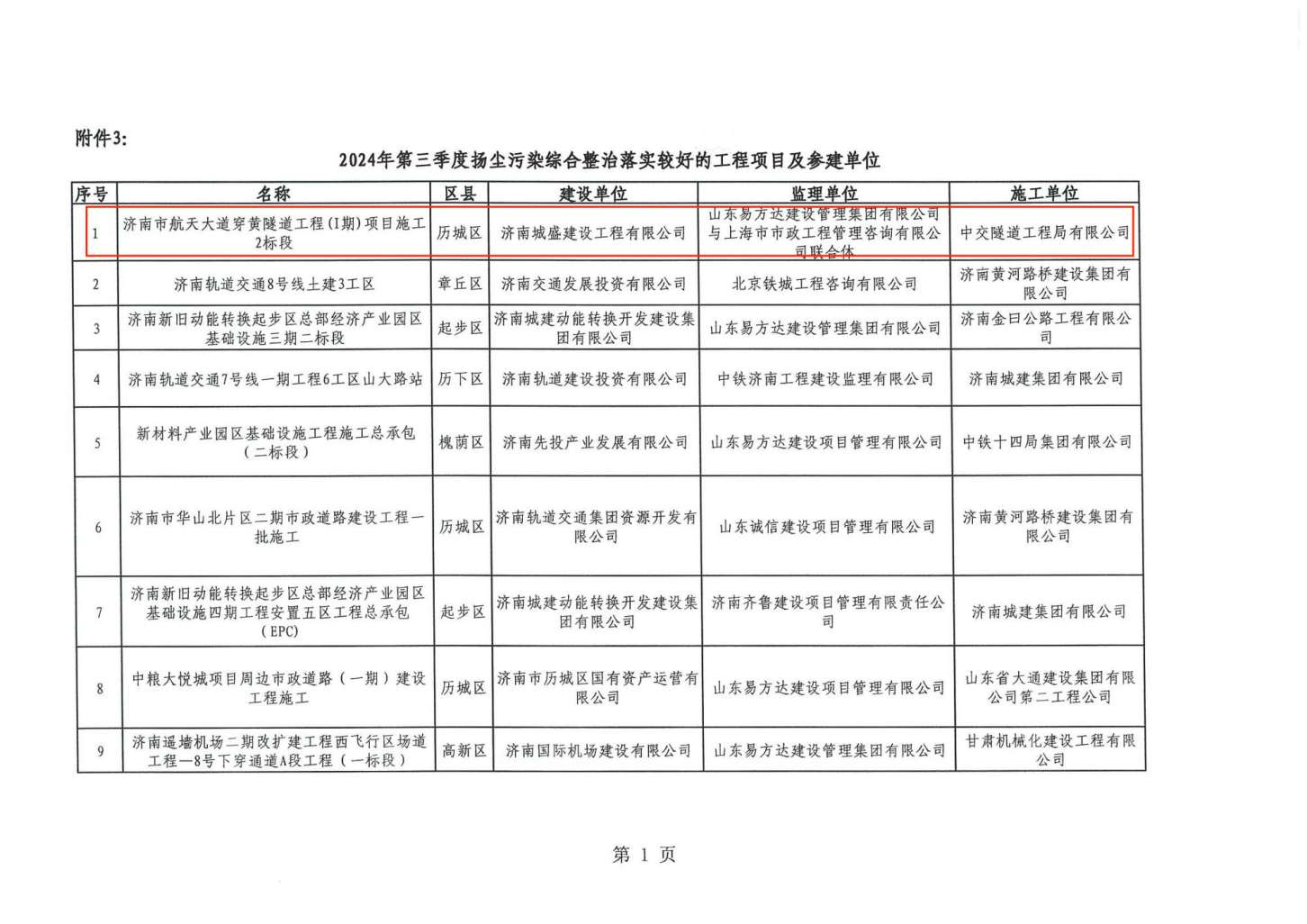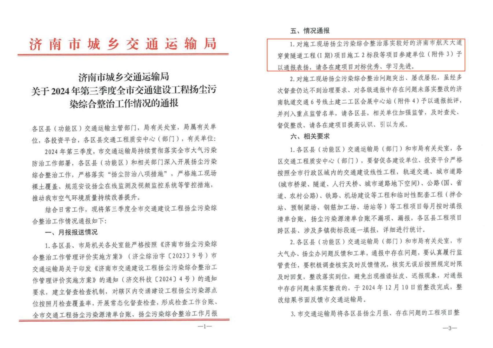 近日,濟(jì)南市城鄉(xiāng)交通運(yùn)輸局公布了2024年第三季度交通建設(shè)工程揚(yáng)塵治理通報(bào),建設(shè)集團(tuán)投資建設(shè)的濟(jì)南市航天大道穿黃隧道工程(I期)項(xiàng)目施工2標(biāo)段脫穎而出,被予以通報(bào)表揚(yáng),該標(biāo)段由中交隧道工程局有限公司承建。