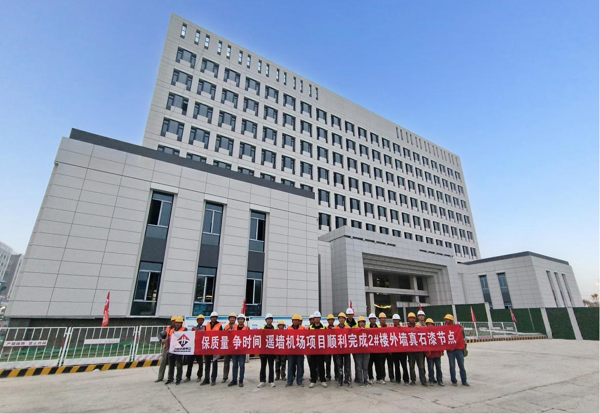 歷經50天施工,濟南遙墻機場配套設施項目2#邊檢物業用房外墻真石漆分項工程順利完工,項目2#邊檢業務用房含邊檢辦公用房和邊檢備勤用房,建成后將做為濟南遙墻機場邊防檢查業務的主要辦公用房。本項目外墻真石漆面積13280平方,整體以乳白色為主色調,外窗上下輔以灰色及白色點綴,整體設計莊重大氣,線條簡單分明。