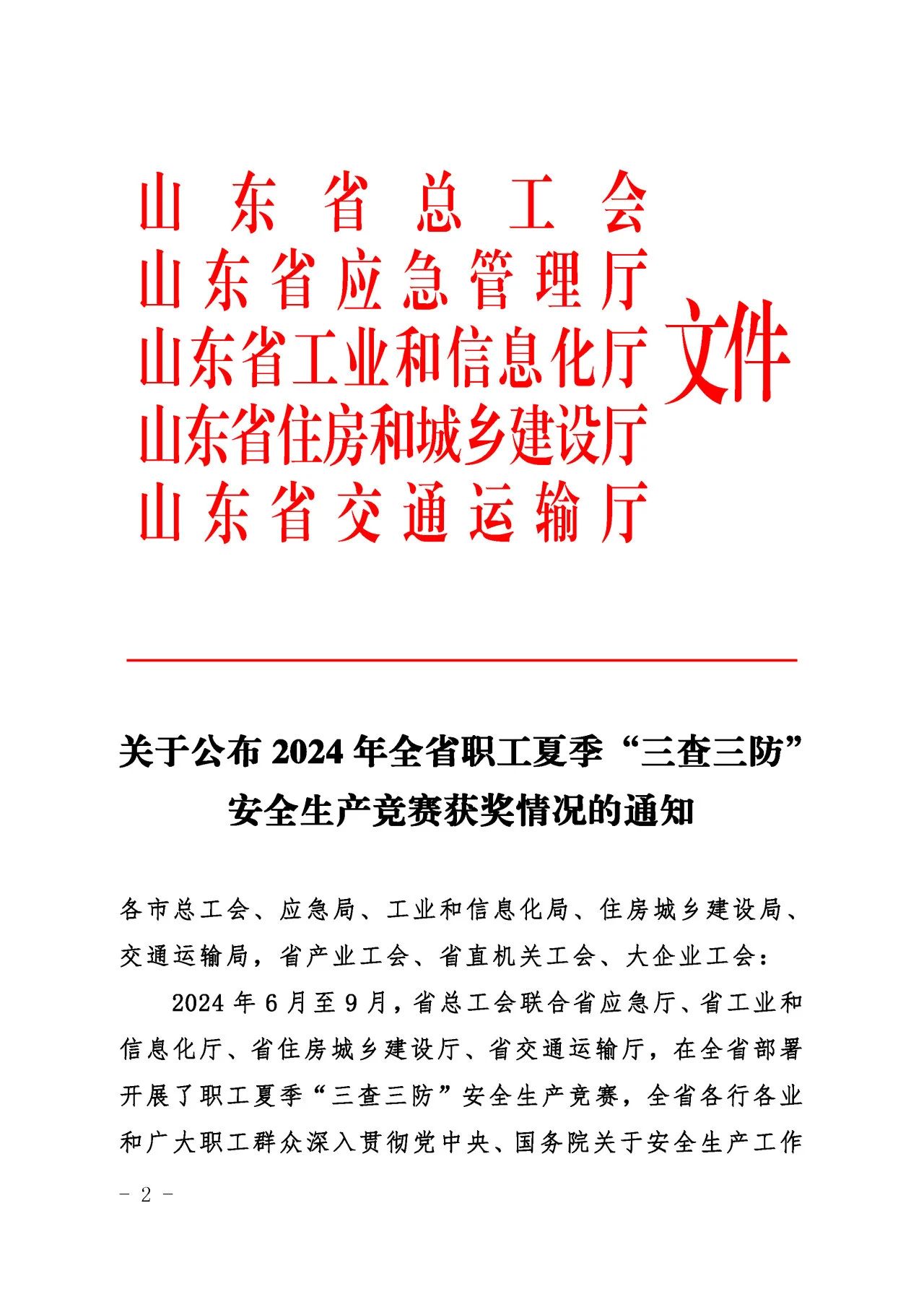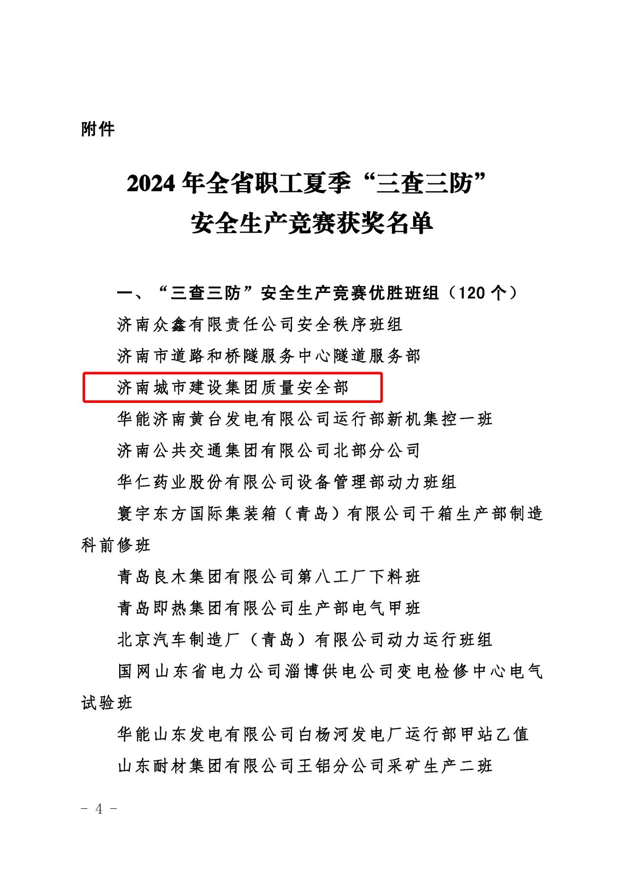 近日,山東省總工會、山東省應急管理廳、山東省工業和信息化廳、山東省住房和城鄉建設廳、山東省交通運輸廳聯合發布了《關于公布2024年全省職工夏季“三查三防”安全生產競賽獲獎情況的通知》,濟南城市建設集團質量安全部積極響應上級主管部門的號召,按照集團黨委的科學部署,全面而深入地開展了各項安全專題活動,榮獲“三查三防”安全生產競賽優勝班組榮譽稱號。