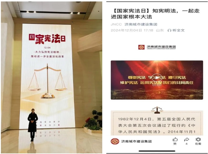 城建集團公司通過懸掛條幅、組織觀看“憲法的精神 法治的力量——2024年度法治人物”專題節目等活動,激發了員工學習憲法的熱情,促使大家主動深入了解憲法,營造良好的普法氛圍。通過開展憲法宣傳周活動,員工法治觀念顯著增強,在公司內部營造出尊崇憲法、學習憲法、遵守憲法、維護憲法、運用憲法的良好氛圍,為公司健康穩定發展筑牢了法治根基。