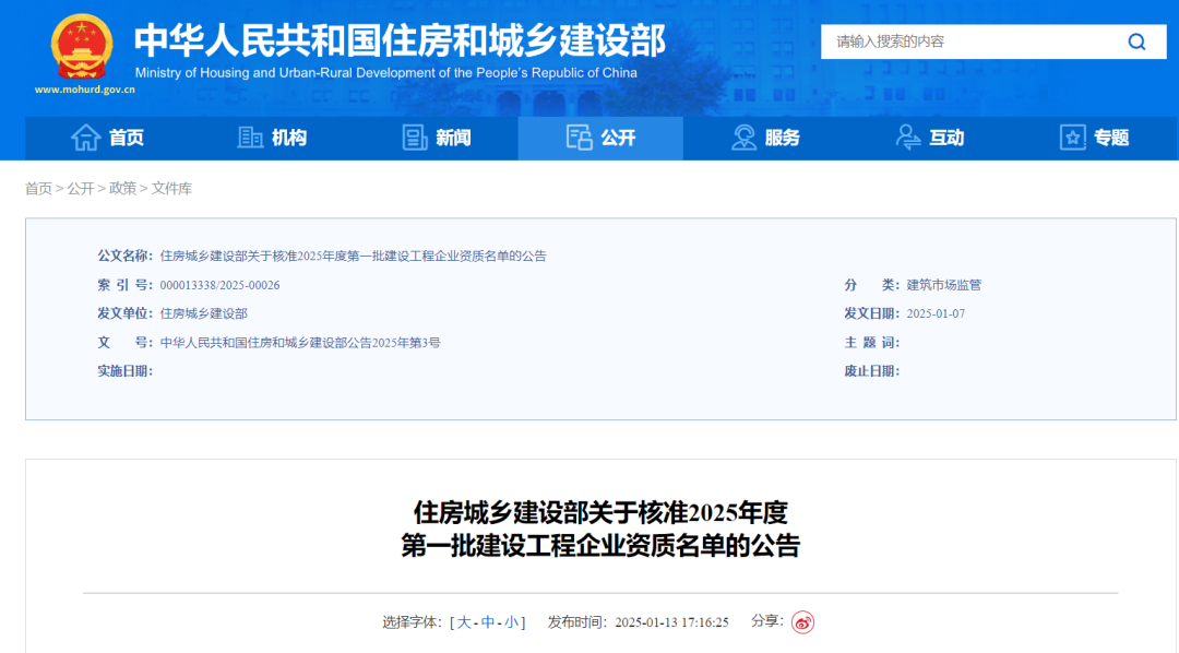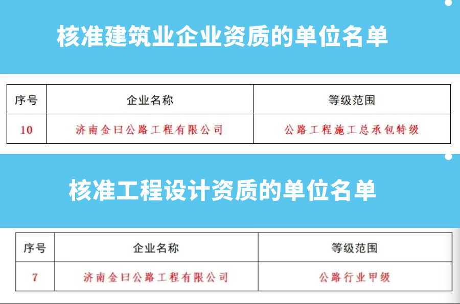 1月13日,住房和城鄉建設部發布《住房城鄉建設部關于核準2025年度第一批建設工程企業資質名單的公告》,濟南城市建設集團所屬濟南金曰公路工程有限公司獲評公路工程施工總承包特級資質和工程設計公路行業甲級資質。