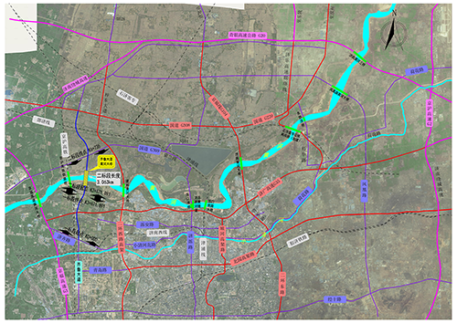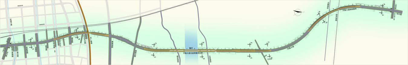 一標(biāo)段南起現(xiàn)狀濟(jì)齊路,向北與虹吸干渠南路、虹吸干渠北路、吳家堡路、治黃路、規(guī)劃路相交,采用高架形式跨越太平河南支路、太平河北支路、美里路、太平河北路、濟(jì)廣高速后,在美里湖路前落地,高架橋兩側(cè)設(shè)置一對輔道實(shí)現(xiàn)各交通流向的轉(zhuǎn)換,終點(diǎn)接黃河大橋引橋,平面線位與規(guī)劃線位一致,道路全長3671.89米。